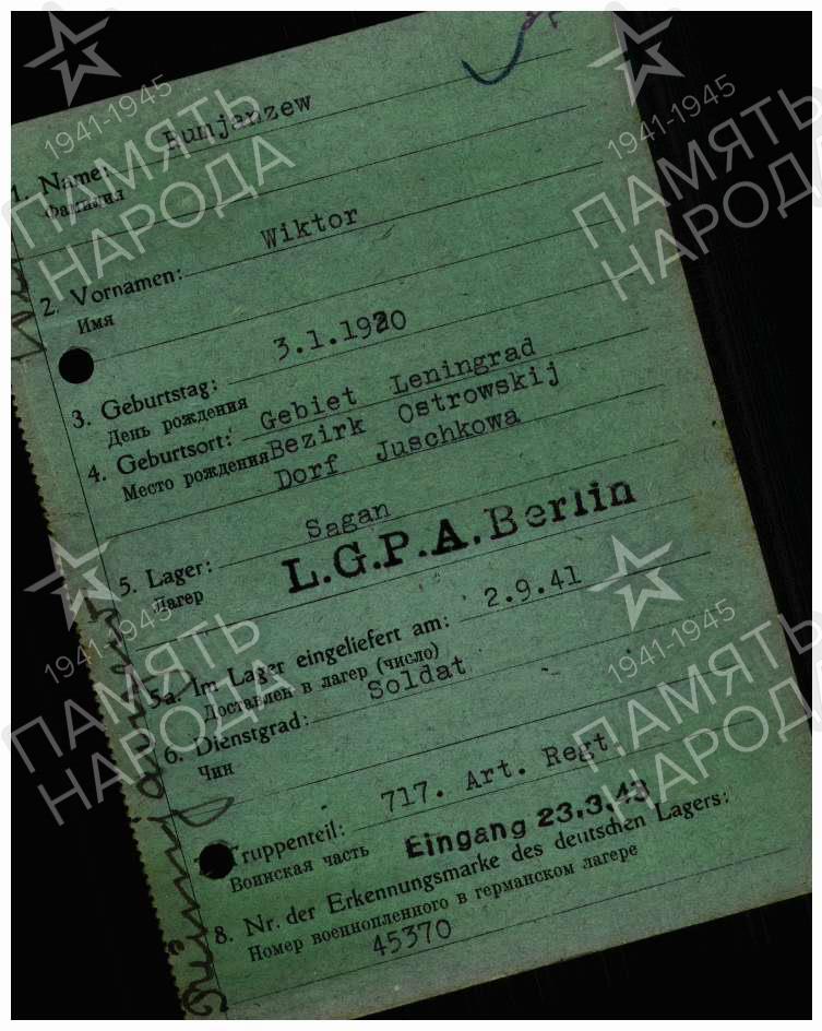 Там же, на портале, даны сканы немецких карточек, которые с педантичностью заполнялись на каждого военнопленного. Вот карточка на Виктора Румянцева: Rumjanzev Wiktor. Gebiet (область) – Leningrad. Bezirk (район) – Ostrowskij. Dorf (деревня)– Juschkowa. Указаны имена отца и матери, и даже адрес ближайших родственников с трудновыговариваемыми для немцев названиями: Pyschkino-Trojzkij, Aljmjakowo.