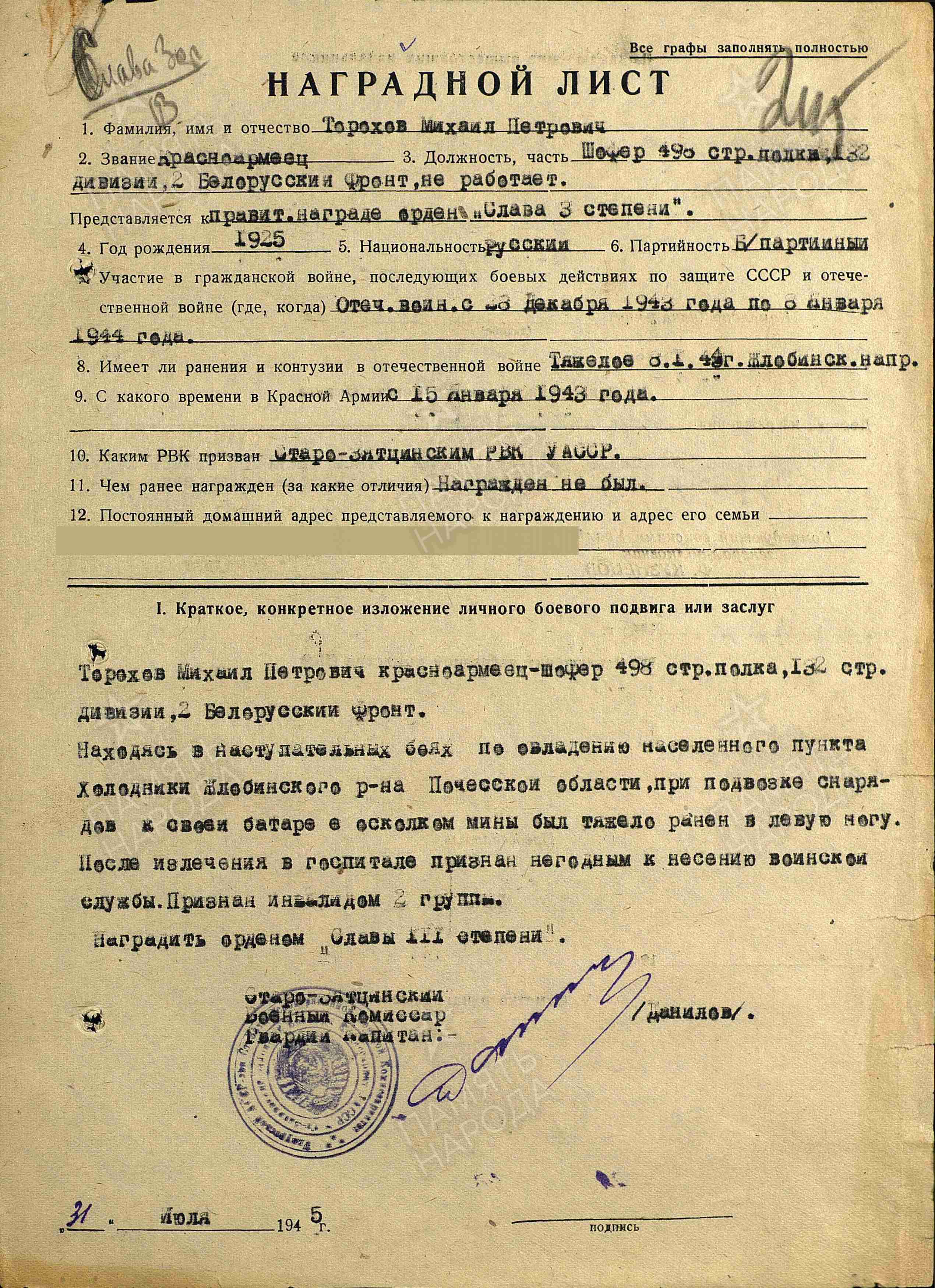 Наградной лист на М.П. Торохова. Источник: портал «Память народа»