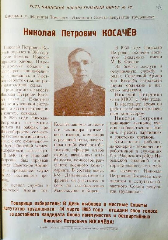 Десять лет отслужил Николай Петрович Косачёв областным военным комиссаром – с 1964 по 1974 год. В 1965 году полковник Косачев был избран депутатом Томского облсовета.