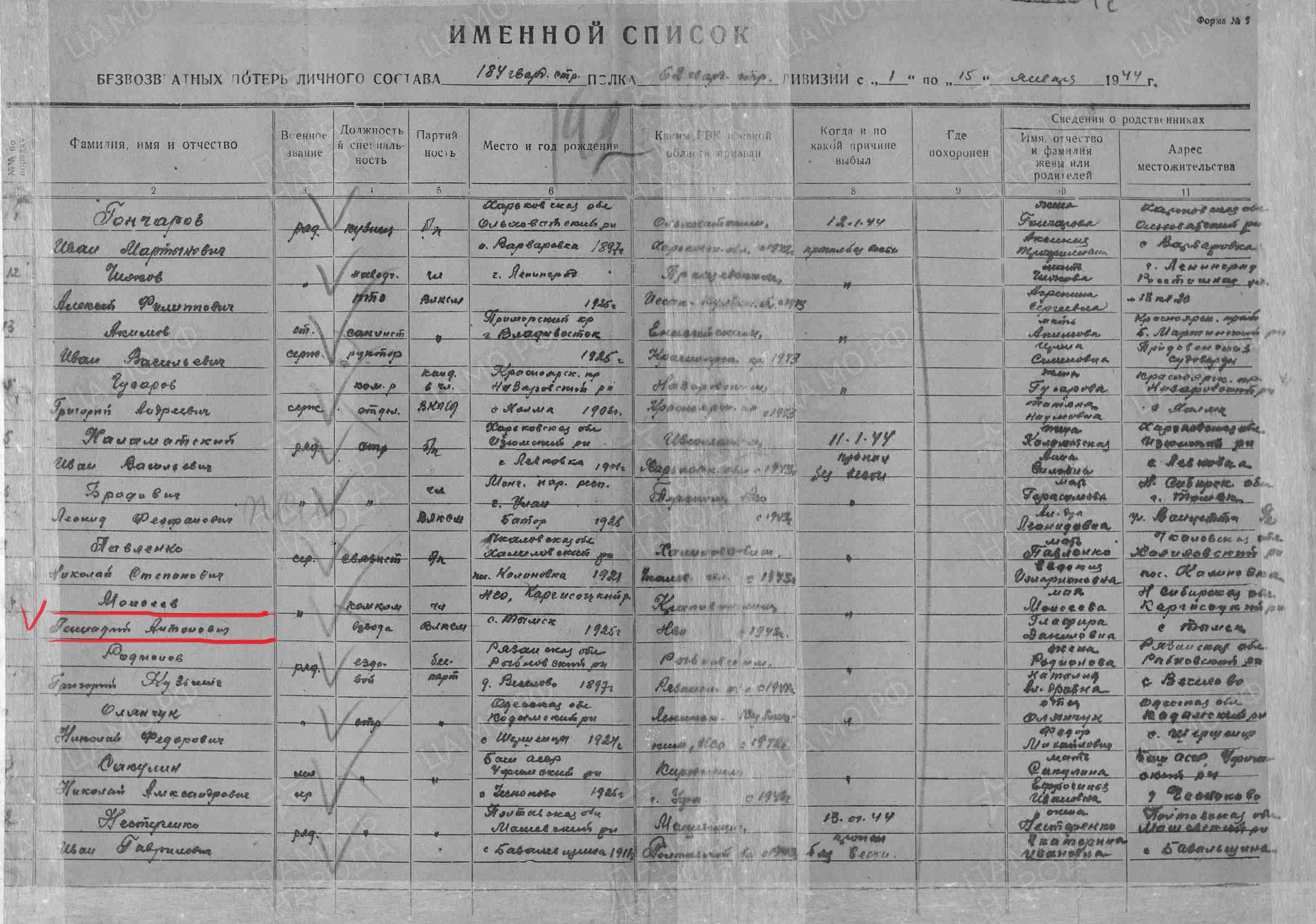 Донесение о пропавших без вести, январь 1944. Источник: портал «Память народа»