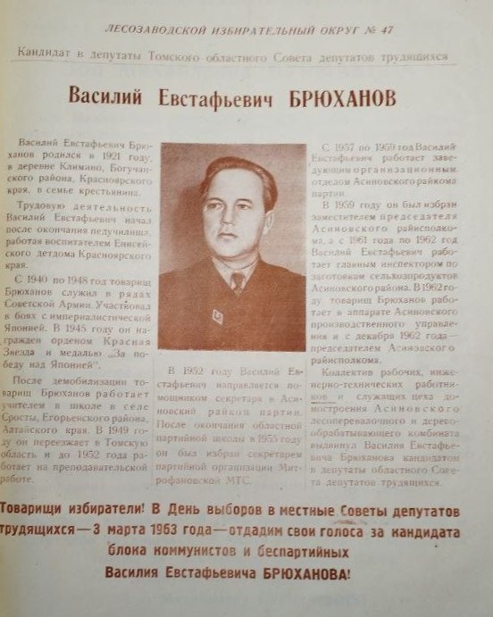 Василий Евстафьевич Брюханов, кандидат в депутаты Томского областного Совета, 1963. Источник: Государственный архив Томской области