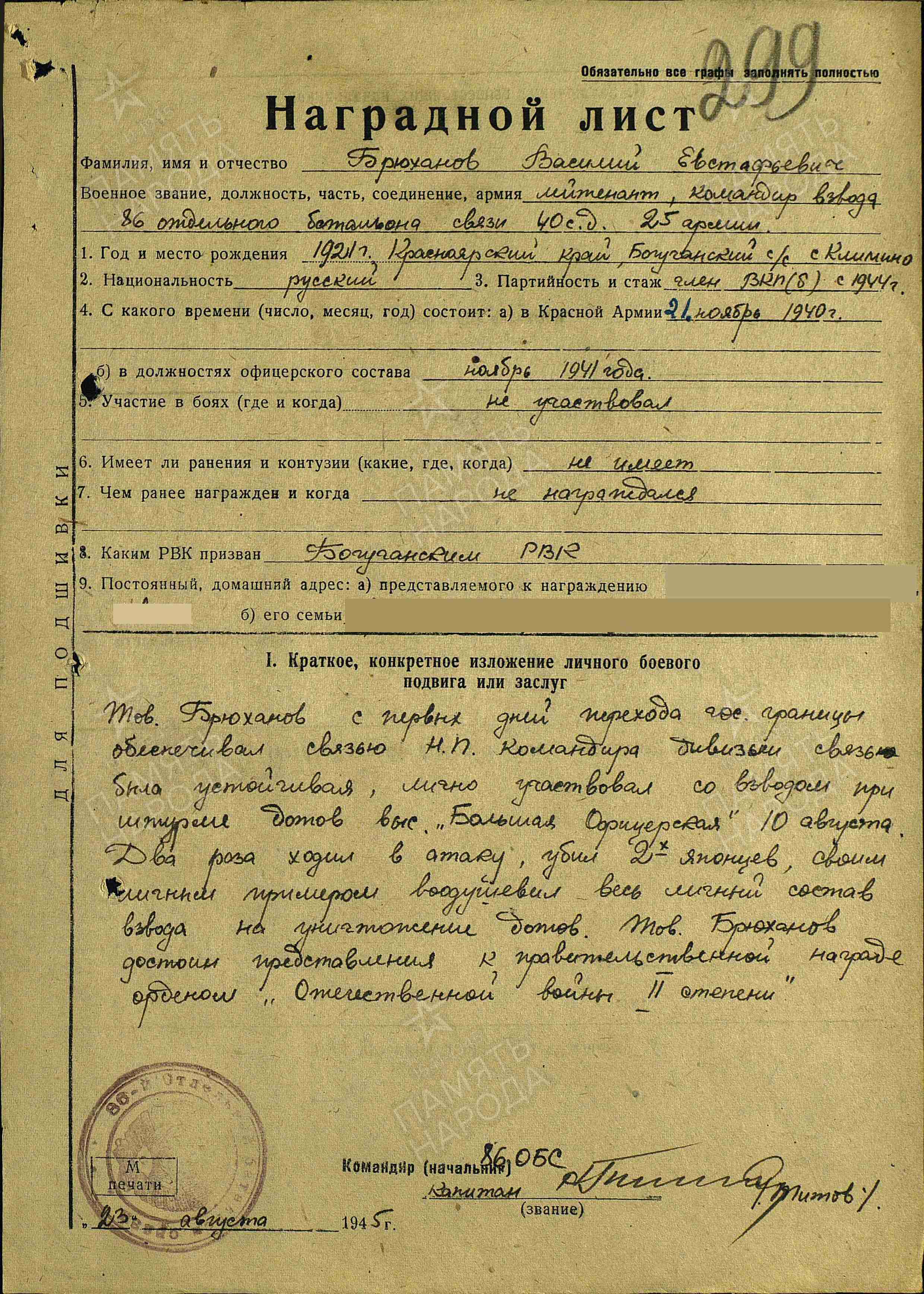 Представление В.Е. Брюханова к ордену. Источник: портал «Память народа»