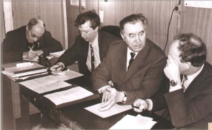 Слева направо — О. Б. Нифонтов, В. И. Музалев. А. И. Демчук, Б. И. Юргин в штабе строительства автодорожного моста через р. Томь, 1995. Из книги «Мосты и судьбы: история Мостоотряда 101». Новосибирск, 2013
