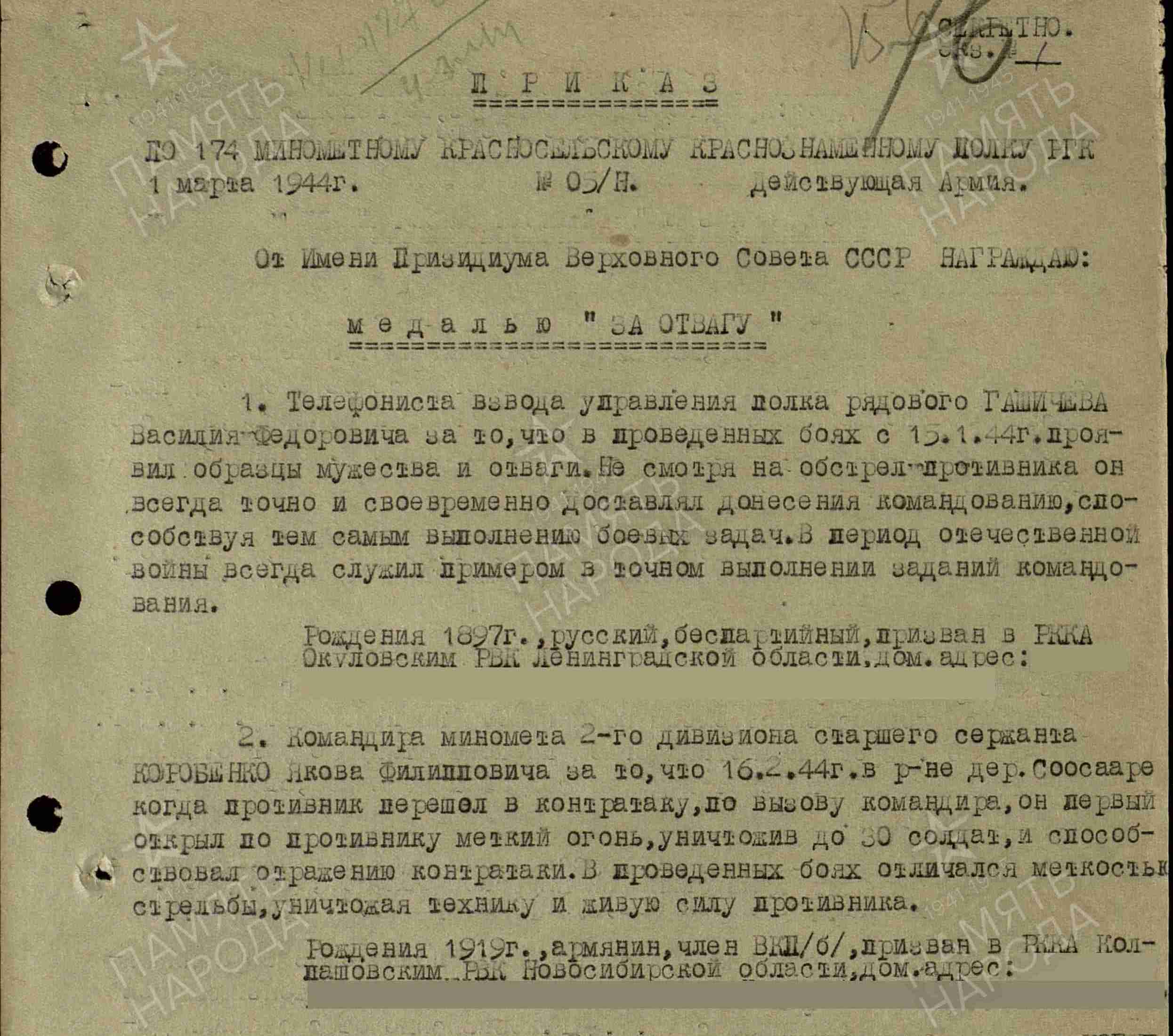 Из приказа о награждении Якова Коробенко медалью «За отвагу». Источник: портал «Память народа»
