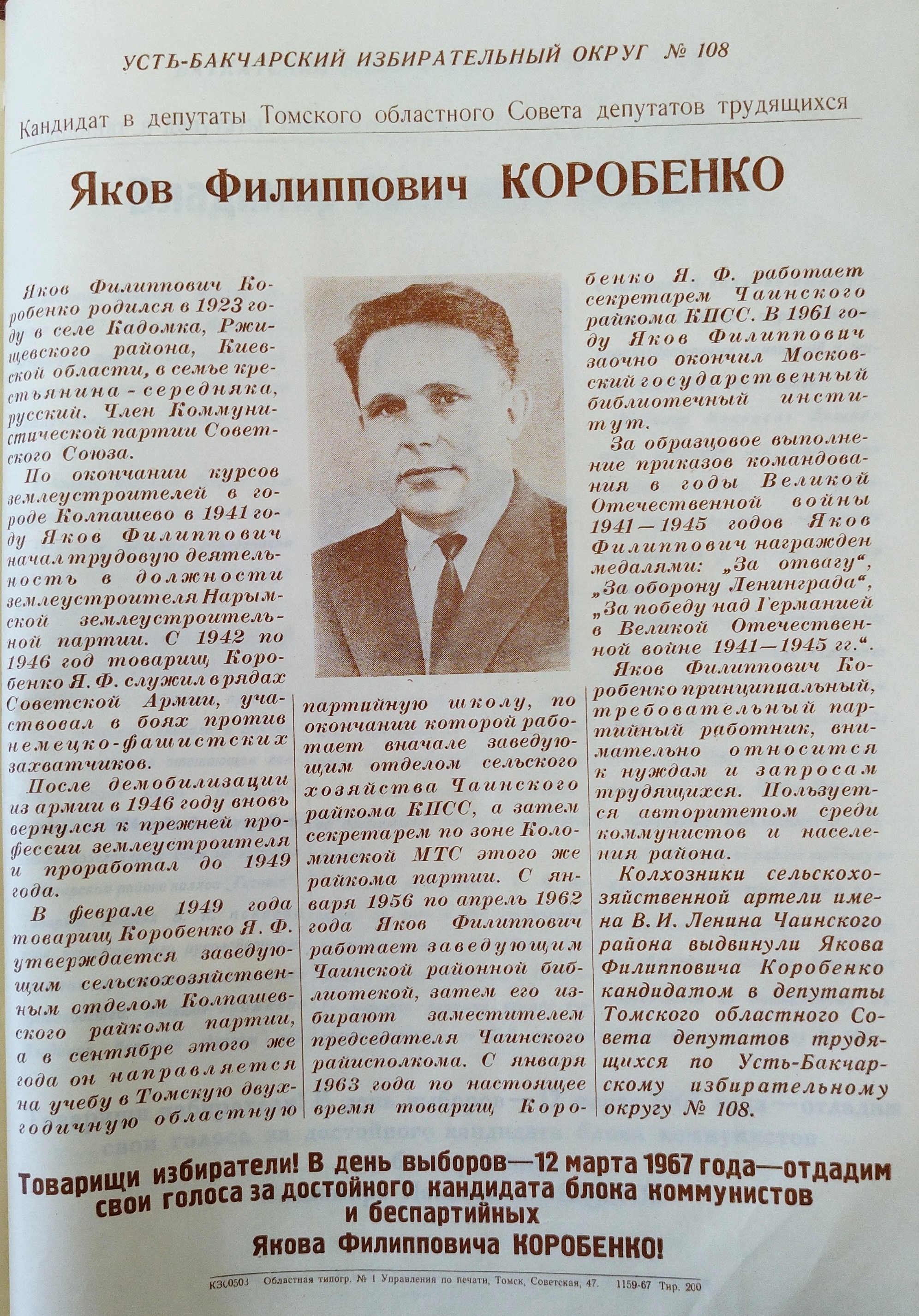 Предвыборная листовка Якова Коробенко. Источник: Государственный архив Томской области