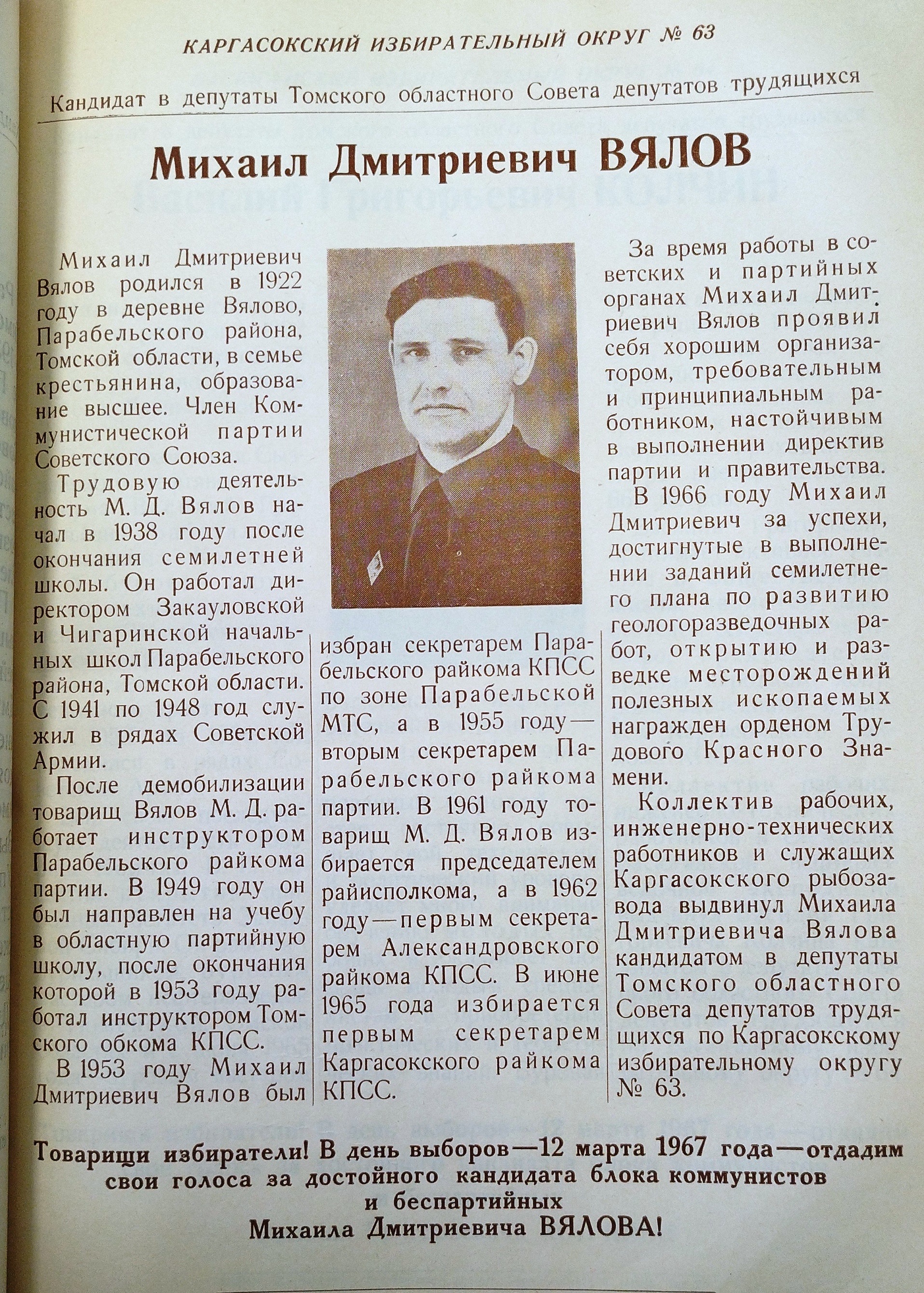 Депутатом областного Совета Михаил Дмитриевич Вялов стал, работая первым секретарем Каргасокского райкома КПСС. Томскому северу он посвятил большую часть своей жизни.