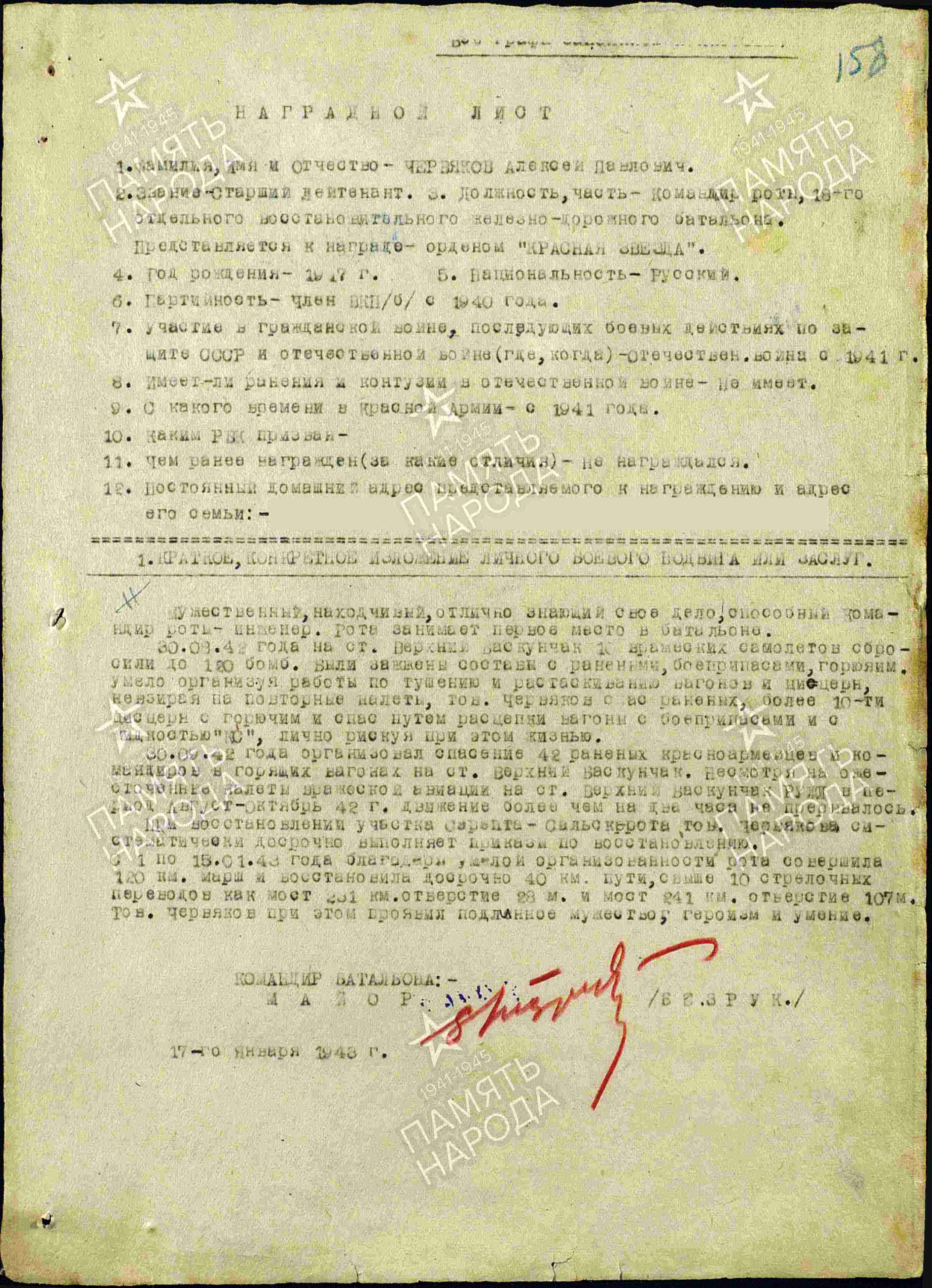 За умелые действия при налете на станцию Верхний Баскунчак Приволжской железной дороги Алексей Червяков был награжден орденом Красной Звезды. В представлении к награде так описывается его подвиг: «30 августа 1942 года на станцию Верхний Баскунчак 10 вражеских самолетов сбросили до 120 бомб. Были зажжены составы с ранеными, боеприпасами, горючим. Умело организуя работы по тушению и растаскиванию вагонов и цистерн, тов. Червяков, не взирая на повторные налеты, спас раненых, 10 цистерн с горючим и спас путем расцепки вагоны с боеприпасами..., лично рискуя при этом жизнью».
