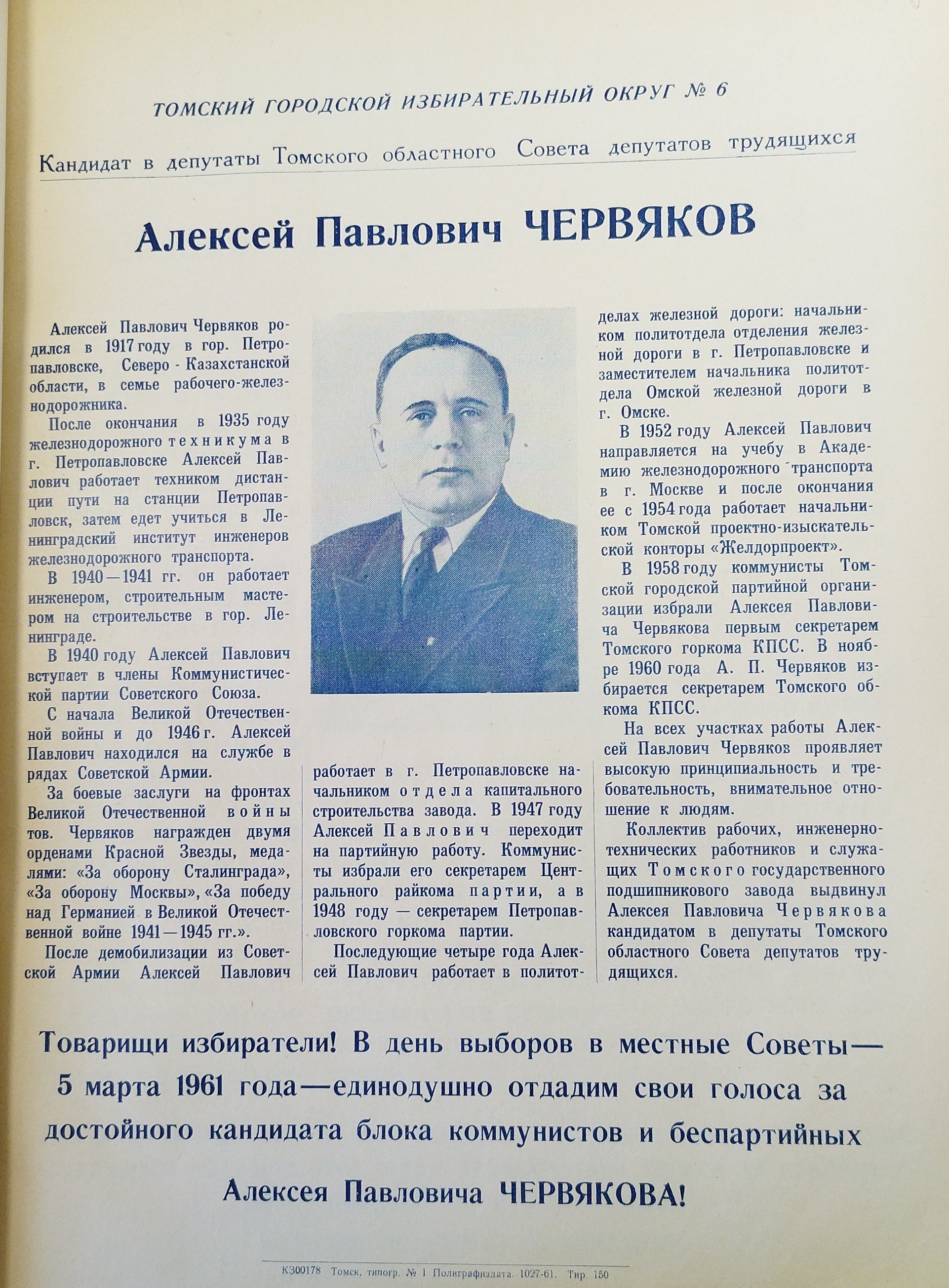 Предвыборный плакат кандидата в депутаты А.П. Червякова. Источник: Государственный архив Томской области
