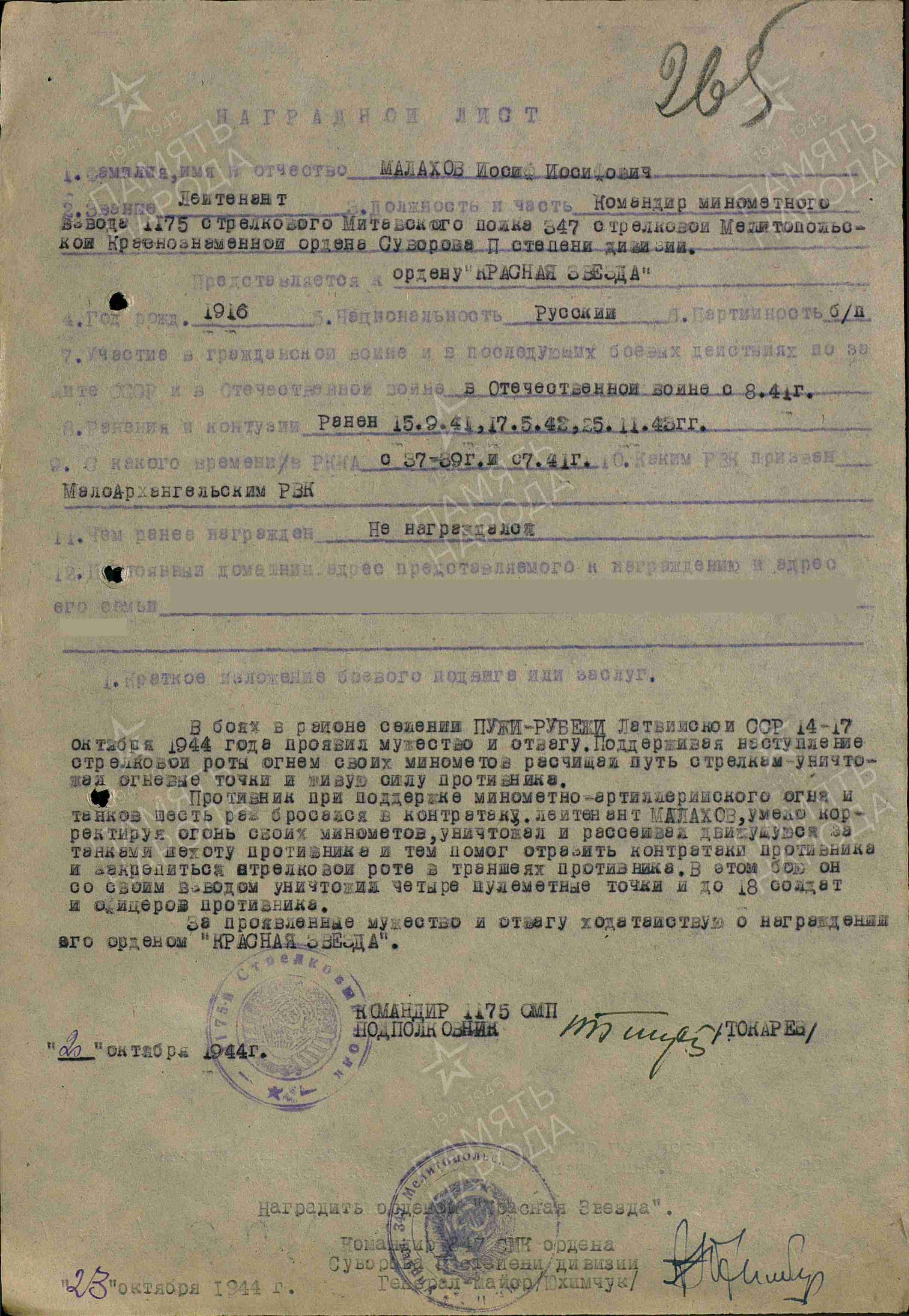 Уже после Победы, в июне 1945 года Иосифа Малахова командир полка 204-й стрелковой дивизии представил к еще одной награде – ордену Отечественной войны II степени. В представлении подполковник Губаревич так обосновал это решение: «За время активного участия в боях Отечественной войны с июля 1941 года лейтенант Малахов имеет три ранения, но ввиду выбытия из части в часть только один раз отмечен правительственной наградой. На основании указания ОК 51 Армии и ОК 1 Гв. СК о награждении активных участников Отечественной войны и в недостаточной мере награжденных, ходатайствую о награждении лейтенанта Малахова орденом...»