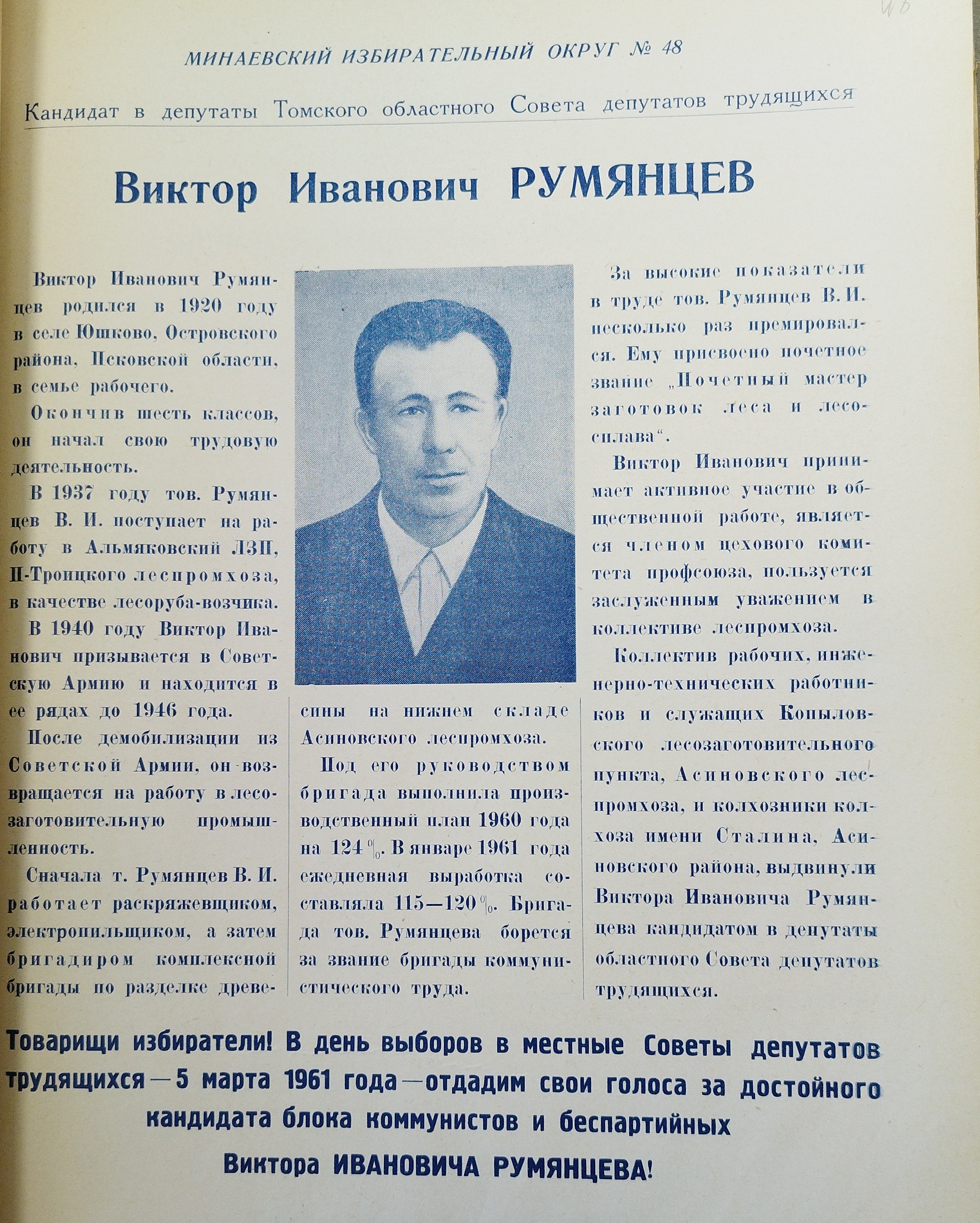 Кандидат в депутаты Томского облсовета Виктор Иванович Румянцев. 1961. Источник: Государственный архив Томской области