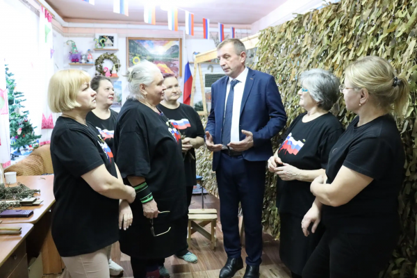 Во время отпуска с передовой депутат Законодательной Думы Томской области, участник специальной военной операции Юрий Журавлев встретился с активистами волонтерской группы «Мы с вами! Мы за мир!». Волонтеры из села Старая Ювала на площадке социальной комнаты организовали работу по изготовлению предметов маскировки и других изделий, необходимых бойцам.